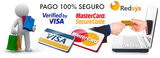 Esta forma de pago es inmediata, totalmente segura y verificada por nuestra pasarela de pago TPV. Todos los pagos efectuados mediante esta vía serán validados por su entidad bancaria y en caso de ser aceptados, nos será remitido de forma automática e instantánea. Se aceptan tarjetas Visa y Mastercard. Este servicio no tiene recargo alguno sobre el importe total de su compra.